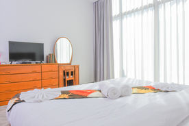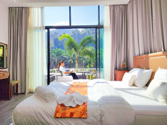 This bright and modern room offers a relaxing stay surrounded by nature. Featuring a comfortable king-size bed with crisp white linens, the room is designed for rest and tranquility. Floor-to-ceiling glass doors open onto a private balcony, where guests can sit back and enjoy beautiful views of lush tropical greenery and limestone hills.